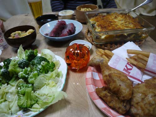 なすとカボチャのグラタンとか、ブロッコリーのサラダとか、マカロニチーズ(娘の人希望)とかを、台所でどったんばったんしながら何とか作って並べてみましたよ。