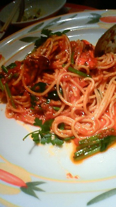 パスタはワタリガニのパスタ。ちょっとスパイシーでウマーウマー(゚д゚)