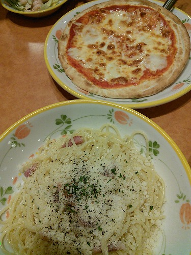ピザはいつものマルゲリータ。パスタは、娘の人はスモークサーモンの和風パスタ、私はペペロンチーノにしました。