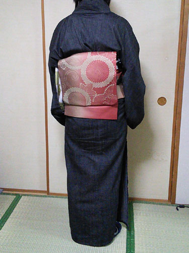 後ろはこんな感じ。相変わらずの矢の字結び。一般的には引き抜かない結び方がメジャーですが、私は完全に引き抜いて結ぶこっちのやり方の方が好きです。羽の大きさを調節しやすいんですよ。